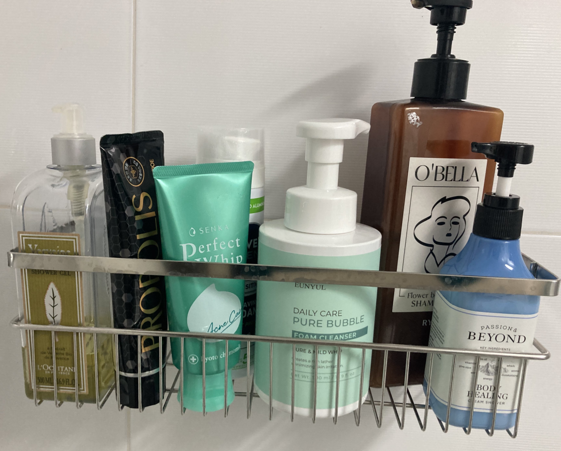 화장실 청소할 때 절대 하지 말아야 하는 게 있는데, 락스 원액을 붐무기에 넣어서 뿌리는 거다. 건강에 이로울 게 없으니 그러면 안 된다. 세면대에 물을 반 정도 담아 생수 뚜껑에 담길 만큼만 넣어주면 된다. 그리고 청소를 하면서 조금씩 추가해주자. 청소하면서 묻어져 나온 세균이 솔에 묻게 되고, 물에 담갔다 빼면서 락스의 항균력이 줄어들기 때문이다. 화장실용 세제가 정말 많은데 거품이 나고 이런 게 중요한 게 아니라 곰팡이를 죽이는 기능에 충실한 락스가 난 제일 좋다. 뭘 써도 상관 없음 (군대에선 치약, 샴푸로 했기 때문). 바이칸 솔은 조금 비싼데 머리카락도 안 끼고 솔의 힘도 좋아서 추천! 솔로 하기 불편한 곳은 수세미로 문질러서 청소하고 있다. 그리고 물로 충~~분히 헹구고 환기를 시켜주자! 그리고 화장실의 모든 제품은 바닥과 닿아서 좋을 게 없다. 아래 사진처럼 선반을 활용하면 화장품 용기에 물때나 곰팡이가 생길 염려도 없어진다.